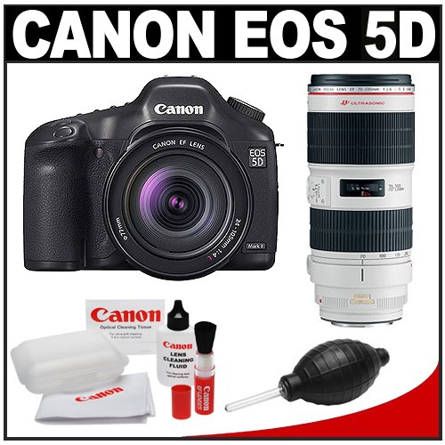 Product Descriptions kit includes: ♦ 1) canon eos 5d stain ii digital slr camera ♦ 2) canon ef 24-105mm l is usm lens ♦ 3) canon ef 70-200mm f/2.8 l is ii usm zoom lens ♦ 4) canon optic cleaning tools ♦ 5) precision create deluxe hurricane blower canon's modernize to the wildly favorite full shape eos 5d is here, and it's best than ever. The eos 5d stain ii has a stunning 21.1-megapixel full-frame cmos sensor together with digic 4 image processor, a expanded iso wander of 100-6400 (expandable to iso l: 50, h1: 12800 and h2: 25600). it can shoot up to 3.9 fps, has 9 af importances plus 6 af aid importances, a fresh 98% coverage conceptionfinder, a 3.0-inch evident conception lcd (920,000 dots/vga) and a rugged make. Full-frame shooters rejoice! the canon ef 24-105mm f/4l "l-series" is usm lens is an simple-to-use acceptable zoom lens that can cover a large zoom area ranging from 24mm wide-angle to 105mm portrait-length telephoto. improving upon one of the most predominant lenses in the canon ef line is no simple feat, but canon has finished particular that. The ef 70-200mm f/2.8l is ii usm extends the speed, operation and optic quality of the ef 70-200 f/2.8l is usm while maintaining all of the characteristics that have made it a legend for pros and advanced amateurs alike. this cleaning tools from canon includes a soft retractable brush, lens cleaning fluid, microfiber cloth, lens tissues and a sturdy plastic case that fits comfortably in any camera bag or coat pocket. the precision create deluxe hurricane blower is extremely suited and simple to use cleaning system.Always pay through Amazon.com Shopping Cart or 1-Click.Your purchase will be protected by the A-to-Z Safe Buying Guarantee. Never respond to requests to send funds via wire transfer. Learn more about Safe Online Shopping. [Read more Canon EOS 5D Mark II Digital SLR Camera w/ EF 24-105mm L IS USM Lens + EF 70-200mm f/2.8 + Cleaning Accessory Kit]